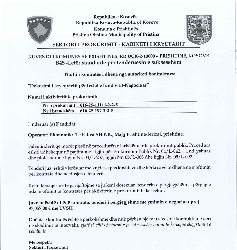 Komuna e Prishtinës, i ka dhënë tender të negociuar prej 97 mijë euro operatorit ekonomik, Te Fatosi Sh.P.K.