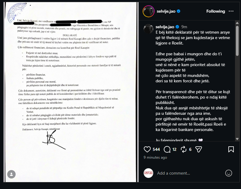 Ajo shprehet se qëllimi i kësaj deklarate është transparenca dhe mbrojtja e interesit të fëmijës së saj, duke nënvizuar se, edhe pse Roeli do të rritet pa praninë e babait, ajo si nënë ka prioritet absolut kujdesin për të në çdo aspekt të jetës, përcjell Indeksonline.