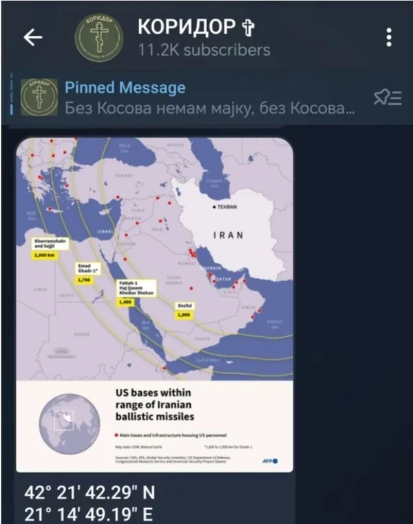 Më herët edhe në këtë kanal janë publikuar koordinatat e kampit Bondsteel me përshkrimin: “Koordinata për iranianët, këtu jeton [kryeministri izraelit Benjamin] Netanyahu dhe të gjithë armiqtë tuaj”.