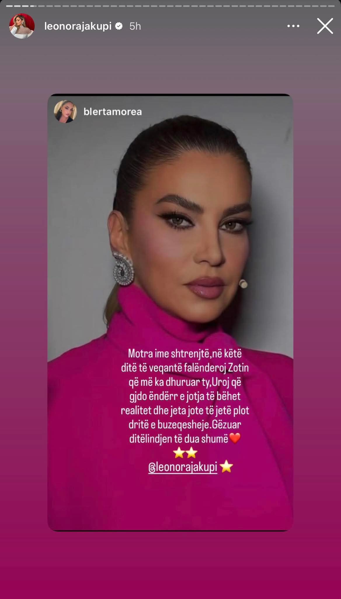 “Motra ime e shtrenjtë, në këtë ditë të veçantë falënderoj Zotin që më ka dhuruar ty. Uroj që çdo ëndërr e jotja të bëhet realitet dhe jeta jote të jetë plot dritë e buzëqeshje. Gëzuar ditëlindjen, të dua shumë”, ka shkruar Blerta.
