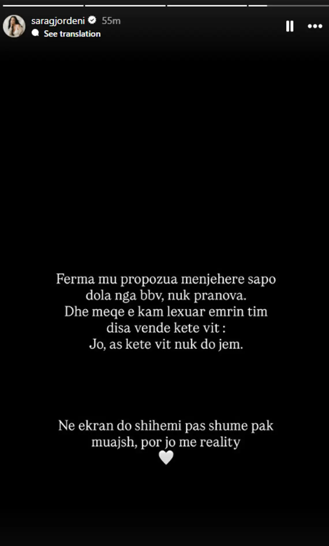 “Ferma mu propozua menjehere sapo dola nga bbv, nuk pranova. Dhe meqe e kam lexuar emrin tim disa vende kete vit: Jo, as kete vit nuk do jem.