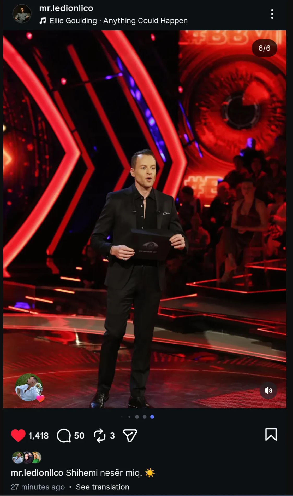 Përmes një karuseli me foto, Ledioni i ftoi ndjekësit të bëhen gati për Prime-in me mbishkrimin e thjeshtë: “Shihemi nesër miq”. Por, ajo që ka “çmendur” fansat dhe ka ngritur një valë aludimesh ndodhet pikërisht në foton e fundit të galerisë.