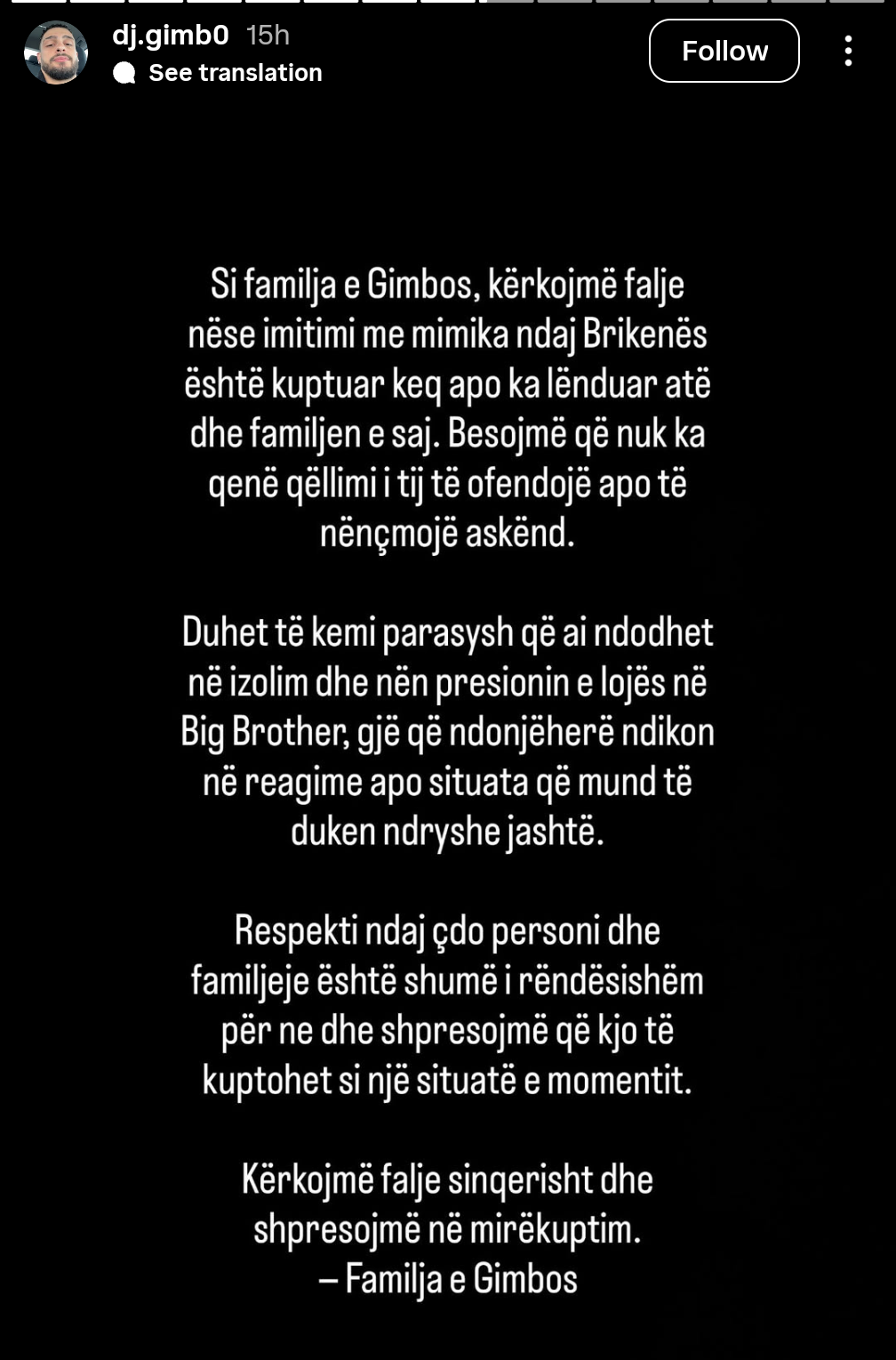 “Si familja e Gimbos, kërkojmë falje nëse imitimi me mimika ndaj Brikenës është kuptuar keq apo ka lënduar atë dhe familjen e saj. Besojmë që nuk ka qenë qëllimi i tij të ofendojë apo të nënçmojë askënd.”