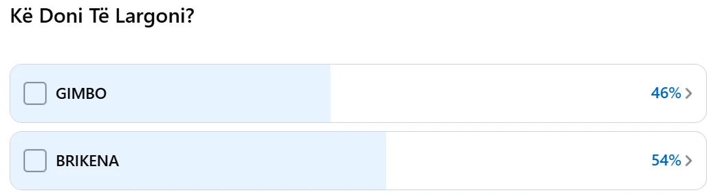 Edhe sondazhi joni me pyetjen: ‘Kë Doni Të Largoni?’ tregon 46% kane votuar per tu larguar Gimbo dhe 54% per Brikenen.