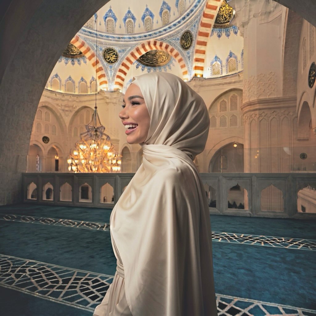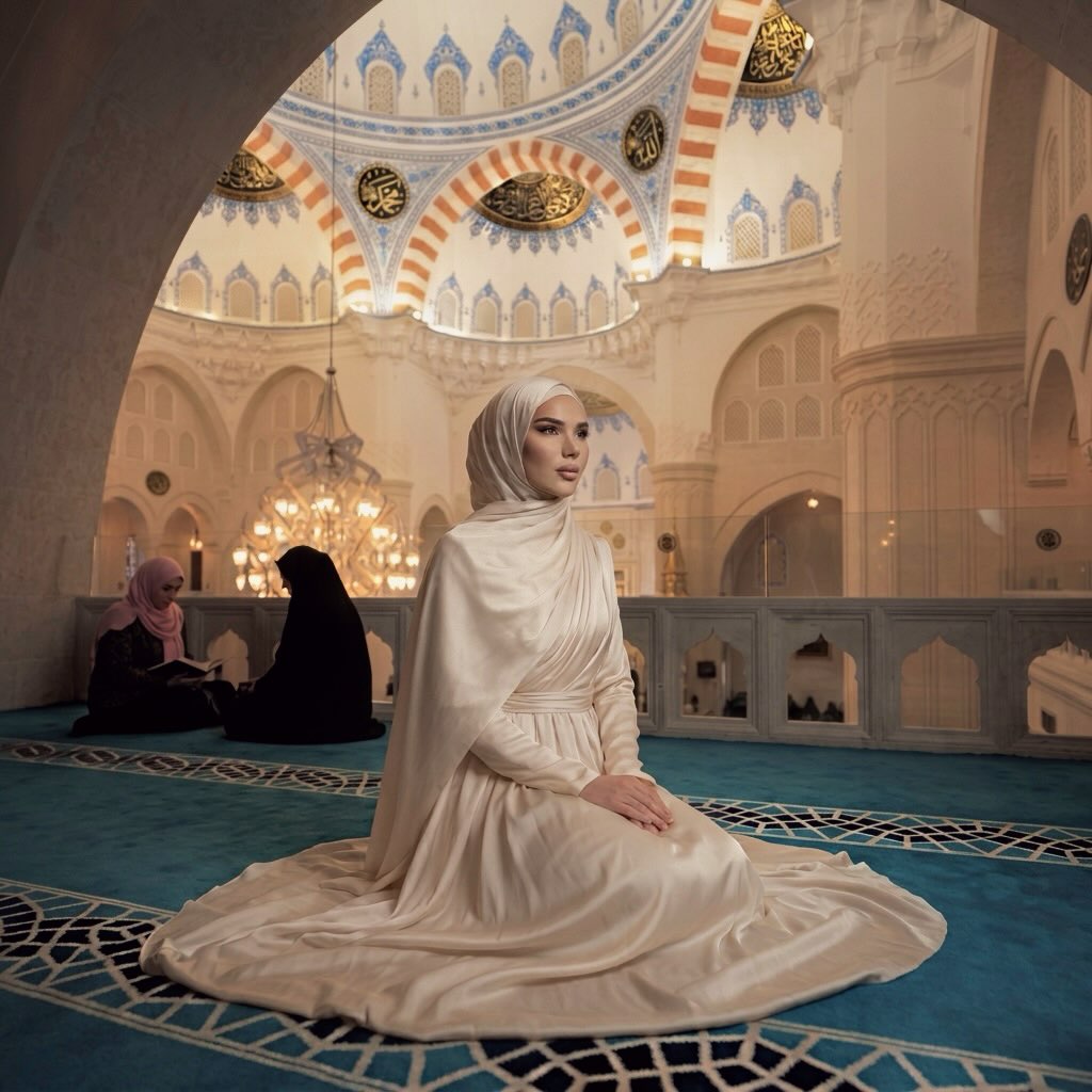 Në postimin e saj, Alba ka publikuar një kolazh fotografish ku shfaqet e mbuluar me një fustan elegant në ngjyrë kremi dhe me shami, brenda një ambienti që ngjan si xhami.