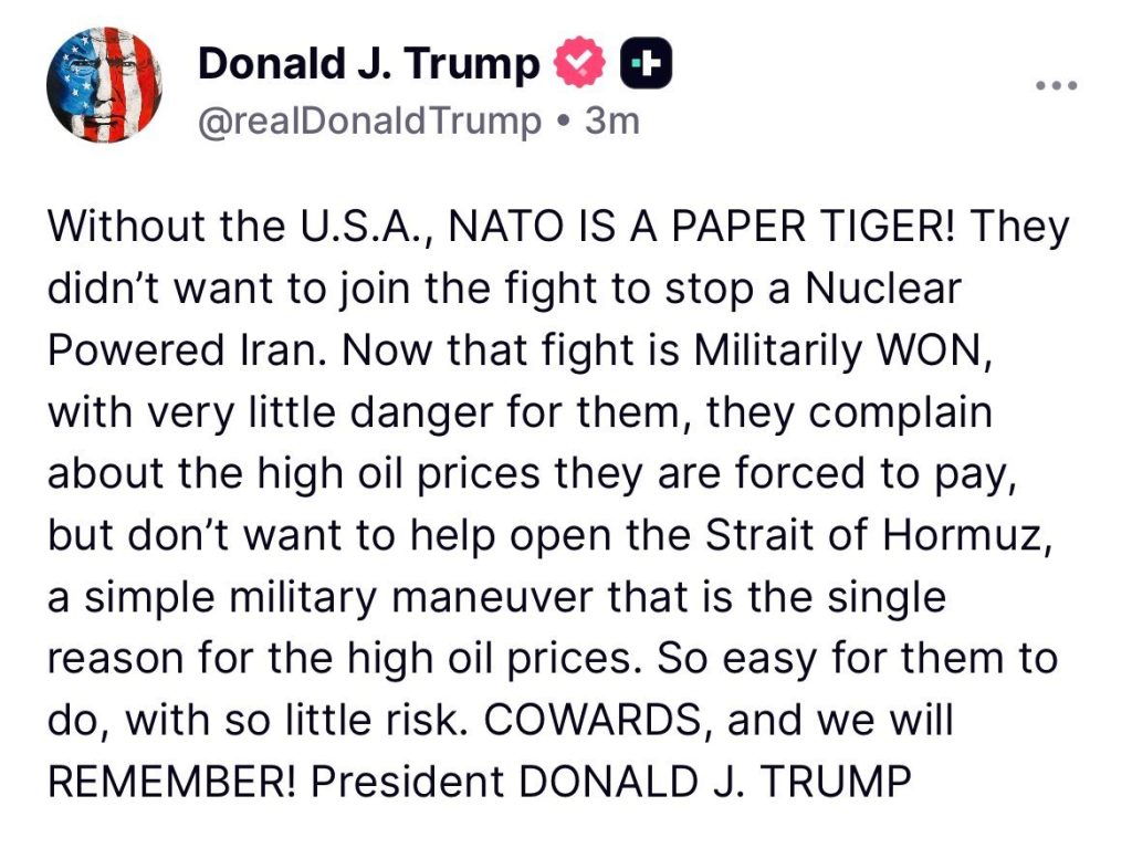 “Pa SHBA-në, NATO ËSHTË NJË TIGËR LETRE! Ata nuk donin të bashkoheshin në luftën për të ndaluar një Iran me fuqi bërthamore.
