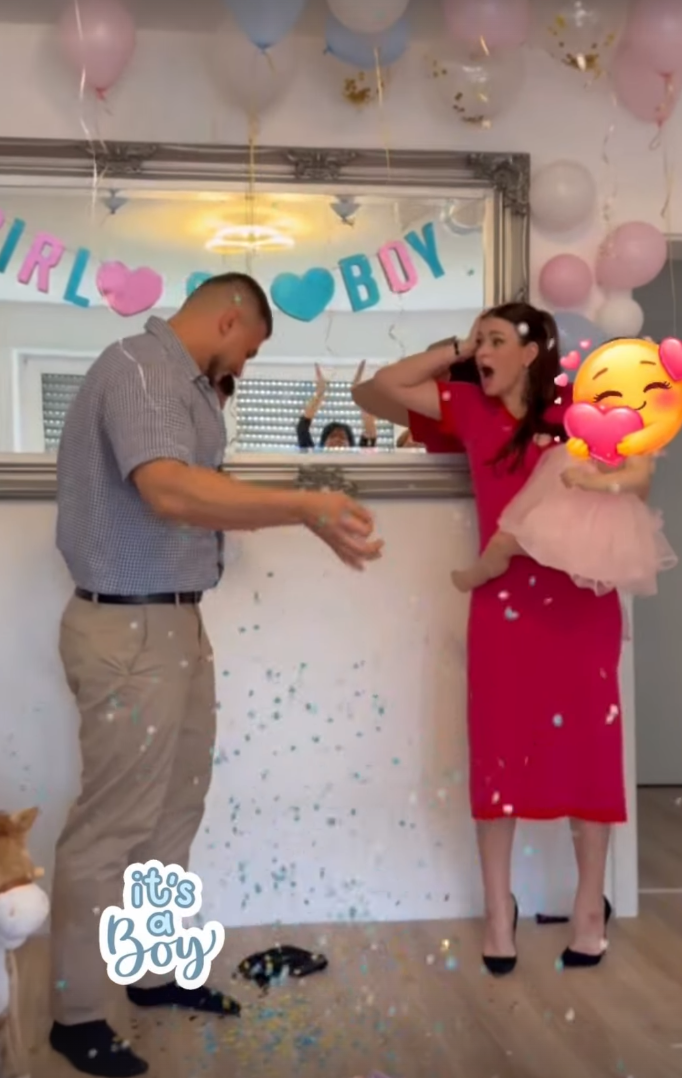 Përmes një feste të organizuar enkas për të zbuluar gjininë e bebit, çifti ndau gëzimin me të gjithë. Në pamjet që kanë qarkulluar dhe që kanë tërhequr menjëherë vëmendjen, buzëqeshjet flasin vetë.