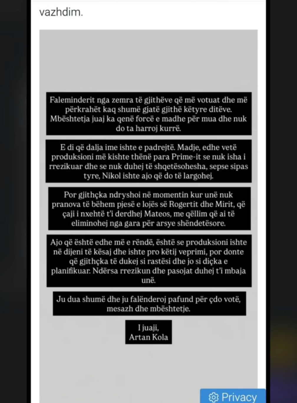 “Ajo që është edhe më e rëndë, është se produksioni ishte në dijeni të kësaj dhe ishte pro këtij veprimi, por donte që gjithçka të dukej si rastësi dhe jo si diçka e planifikuar. Ndërsa rrezikun dhe pasojat duhej t’i mbaja unë,” mbyllet deklarata që mban firmën “I juaji, Artan Kola”.