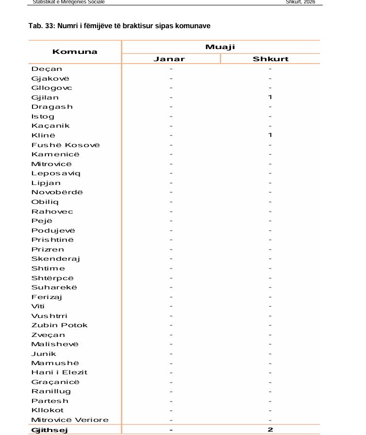 Sipas të dhënave të publikuara nga Agjencia e Statistikave të Kosovës, gjatë muajit shkurt 2026 janë regjistruar gjithsej 2 raste të braktisjes së fëmijëve në nivel vendi. Krahasuar me muajin janar, ku nuk është raportuar asnjë rast, ky numër shënon një rritje të lehtë.