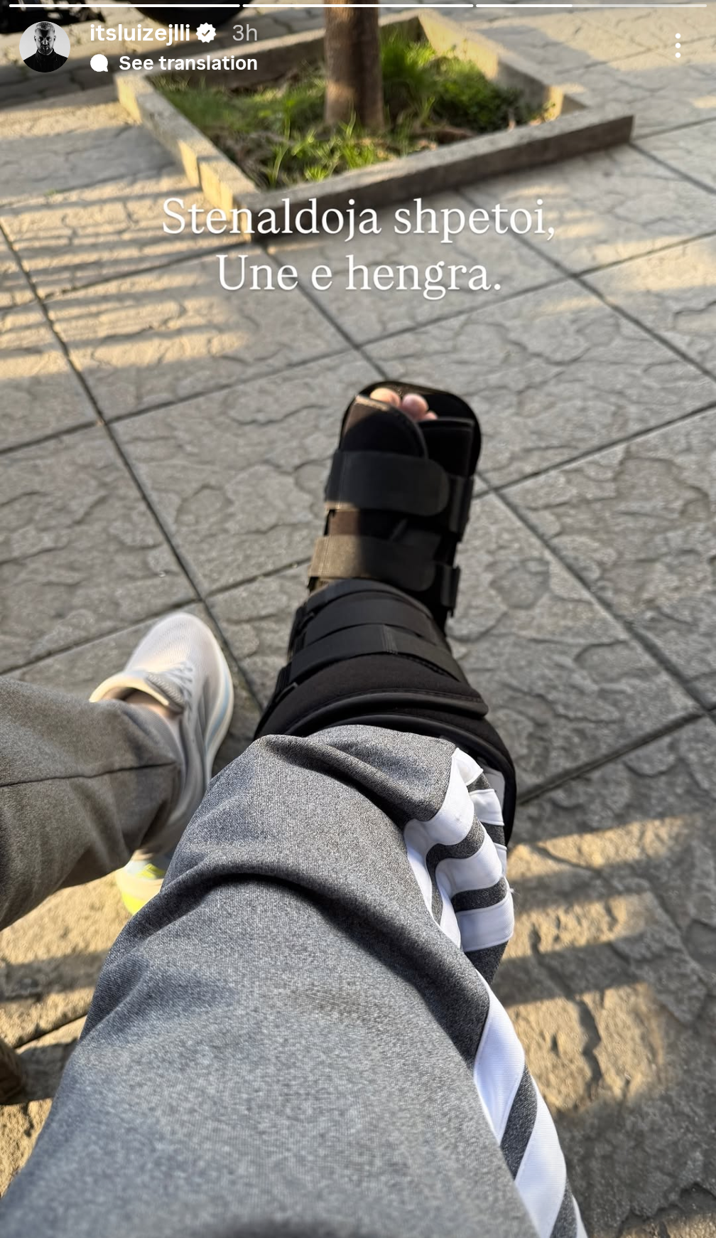 Përmes një fotografie të ndarë në InstaStory, Luizi ka treguar njërën këmbë të vendosur në një pajisje ortopedike, e cila përdoret zakonisht pas lëndimeve fizike apo thyerjeve.