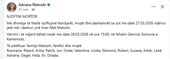 “Me dhimbje të thellë njoftojmë familjarët, miqtë dhe dashamirët se sot me datë 27.03.2026 ndërroi jetë më i dashuri ynë Imer Mat Matoshi. Varrimi i të ndjerit bëhet nesër me datë 28.03.2026 në ora 15:00, në fshatin Gëmicë, Komuna e Kamenicës”, thuhet në njoftim.