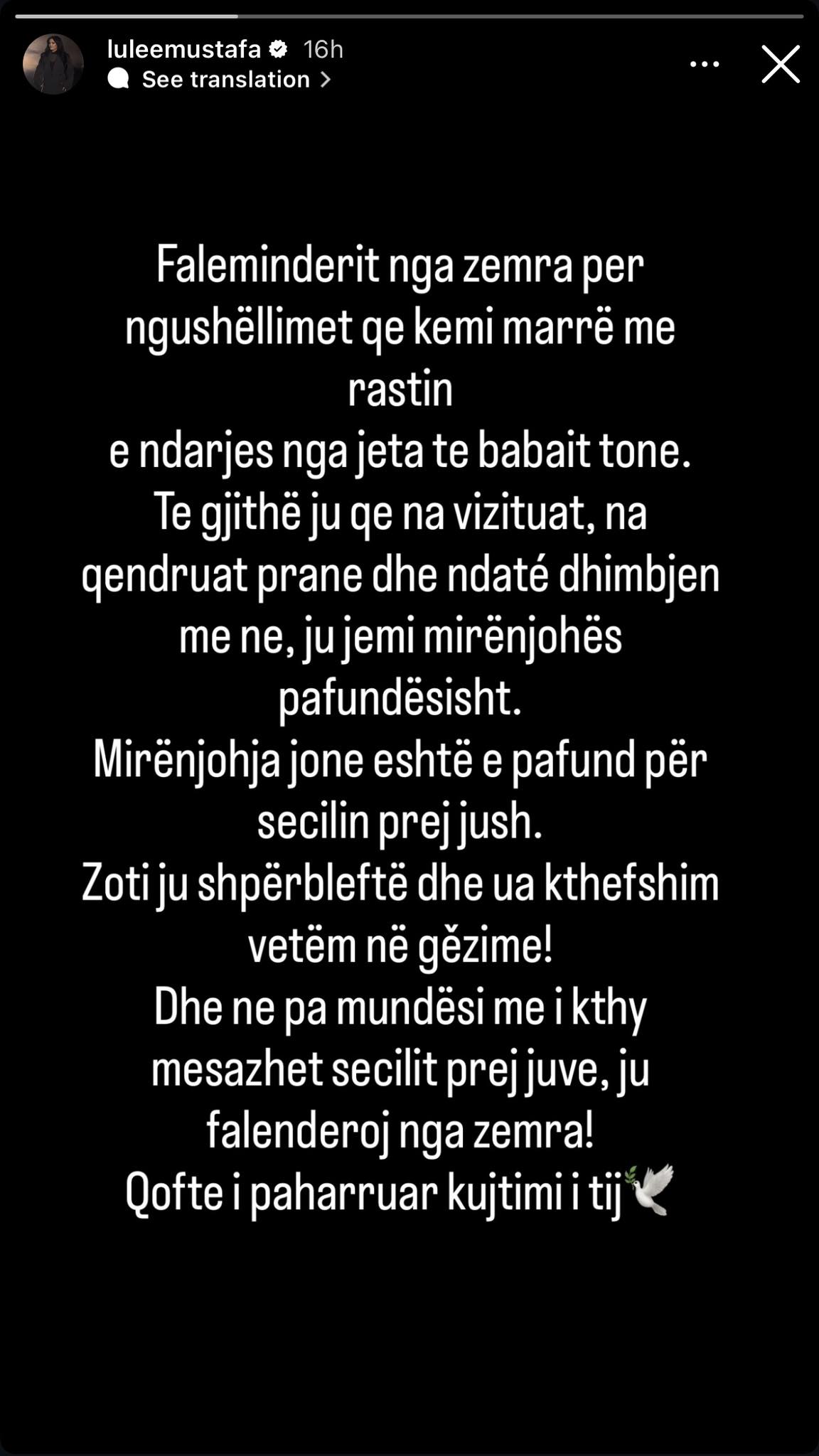 Lule Mustafa ka zgjedhur që përmes një postimi në Instastory të falënderojë të gjithë ata që kanë qenë pranë familjes në këto ditë zie, shkruan “Kosovarja”.
