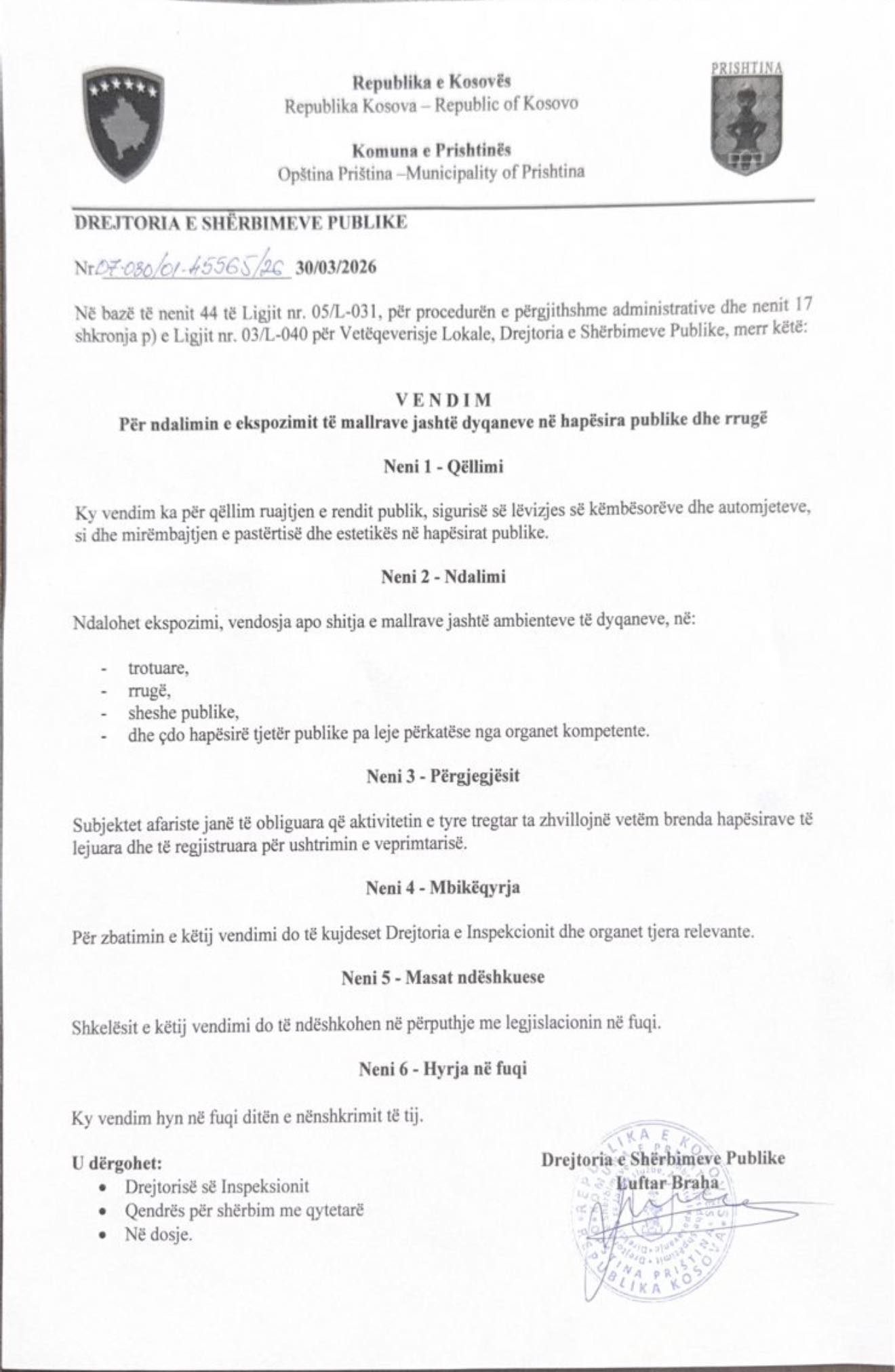 Vendimi i Komunës thekson se dyqaneve u ndalohet të ekspozojnë mallra në trotuare, rrugë, sheshe publike, dhe çdo hapësirë tjetër publike pa leje përkatëse nga organet kompetente.