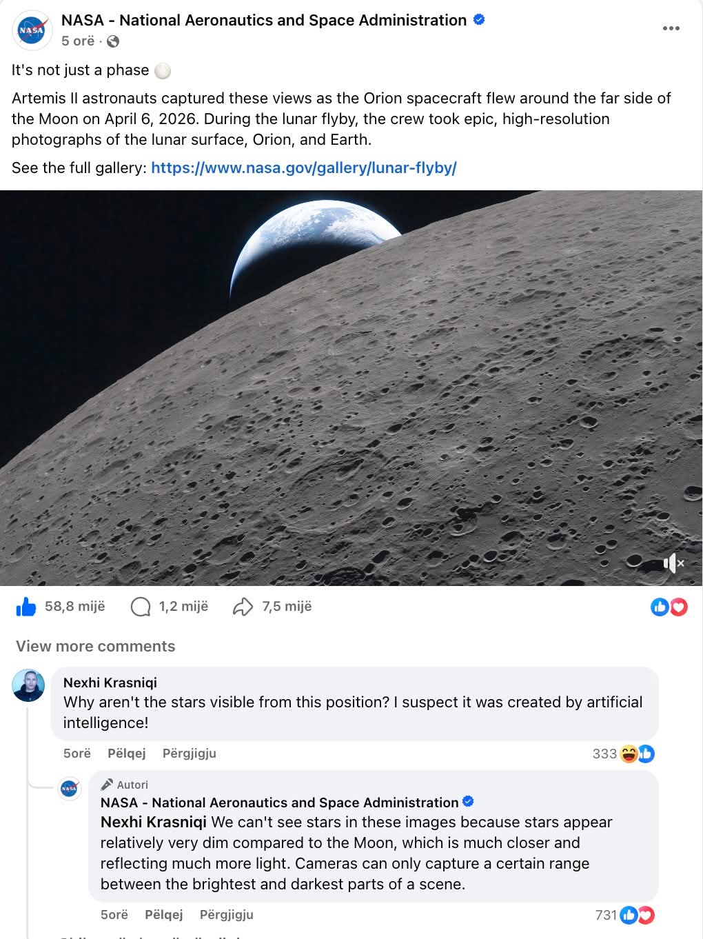 Ky shkëmbim i drejtpërdrejtë komentesh mes të riut shqiptar dhe agjencisë më të madhe hapësinore në botë është shpërndarë me shpejtësi, duke u kthyer menjëherë në një nga episodet më virale të ditës në rrjetet sociale.