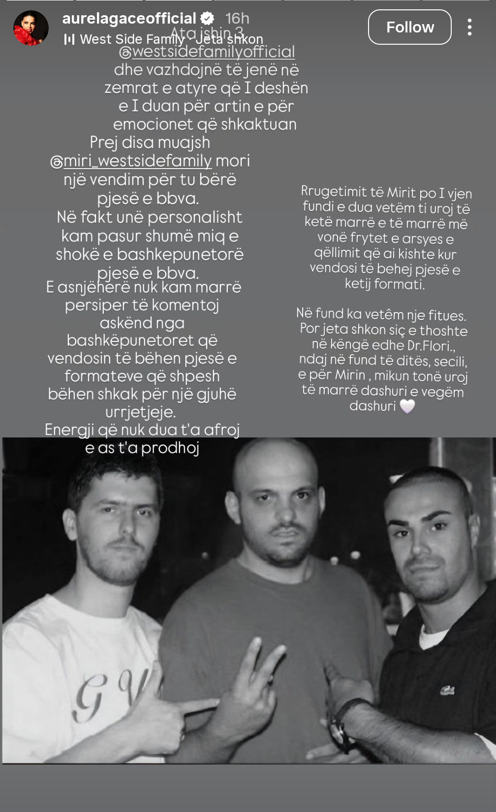 “Ata ishin 3 @westsidefamilyofficial dhe vazhdojnë të jenë në zemrat e atyre që i deshën e i duan për artin e për emocionet që shkaktuan. Prej disa muajsh @miri_westsidefamily mori një vendim për t’u bërë pjesë e BBVA. Në fakt unë personalisht kam pasur shumë miq e shokë e bashkëpunëtorë pjesë e BBVA. E asnjëherë nuk kam marrë përsipër të komentoj askënd nga bashkëpunëtorët që vendosin të bëhen pjesë e formateve që shpesh bëhen shkak për një gjuhë urrejtjeje. Energji që nuk dua t’a afroj e as t’a prodhoj.”