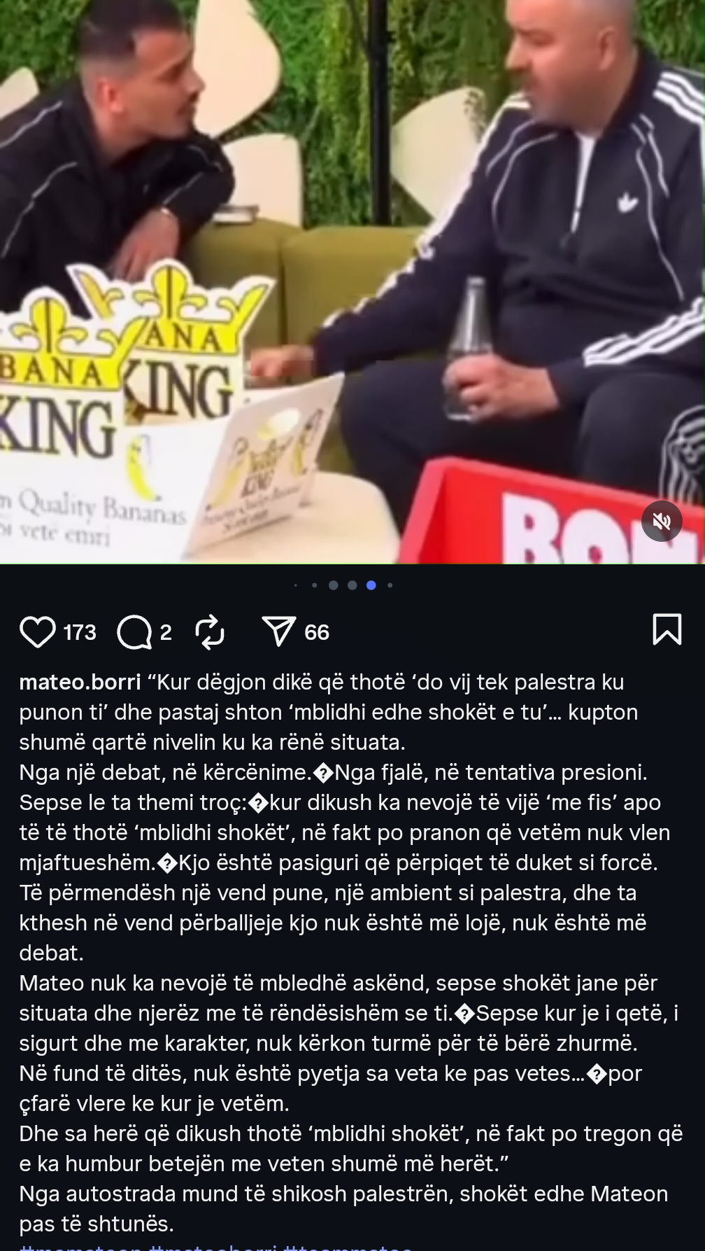 “Kur dikush ka nevojë të vijë ‘me fis’ apo të të thotë ‘mblidhi shokët’, në fakt po pranon që vetëm nuk vlen mjaftueshëm. Kjo është pasiguri që përpiqet të duket si forcë… Mateo nuk ka nevojë të mbledhë askënd, sepse shokët janë për situata dhe njerëz më të rëndësishëm se ti. Sepse kur je i qetë, i sigurt dhe me karakter, nuk kërkon turmë për të bërë zhurmë.”