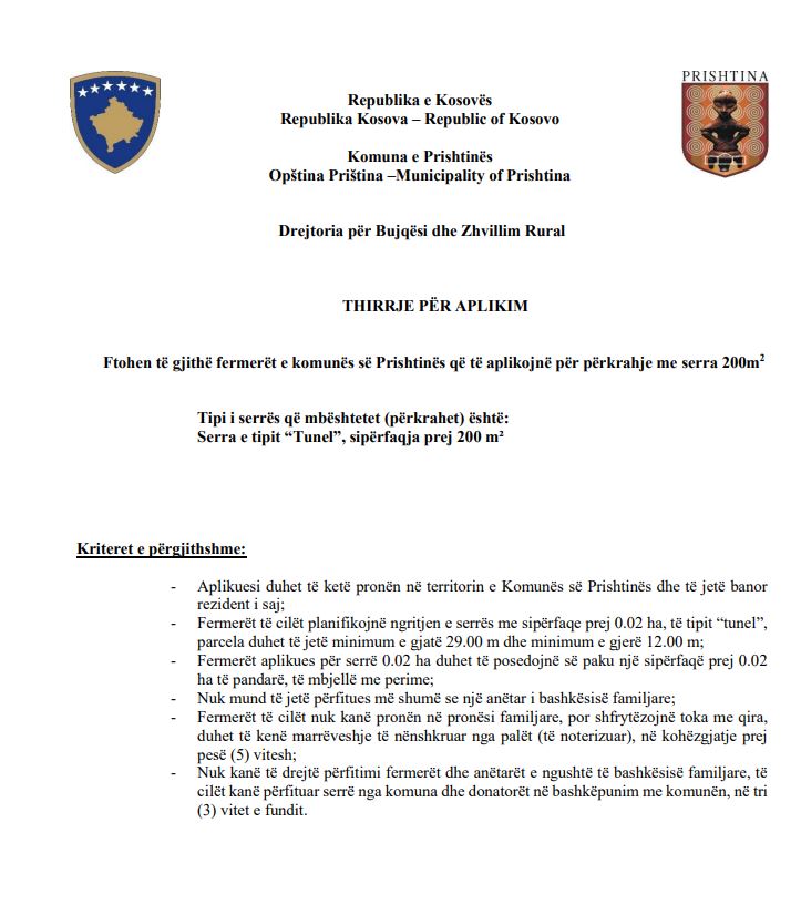 Komuna e Prishtinës njofton se është hapur thirrja për aplikim për përkrahje në ndërtimin e serave.