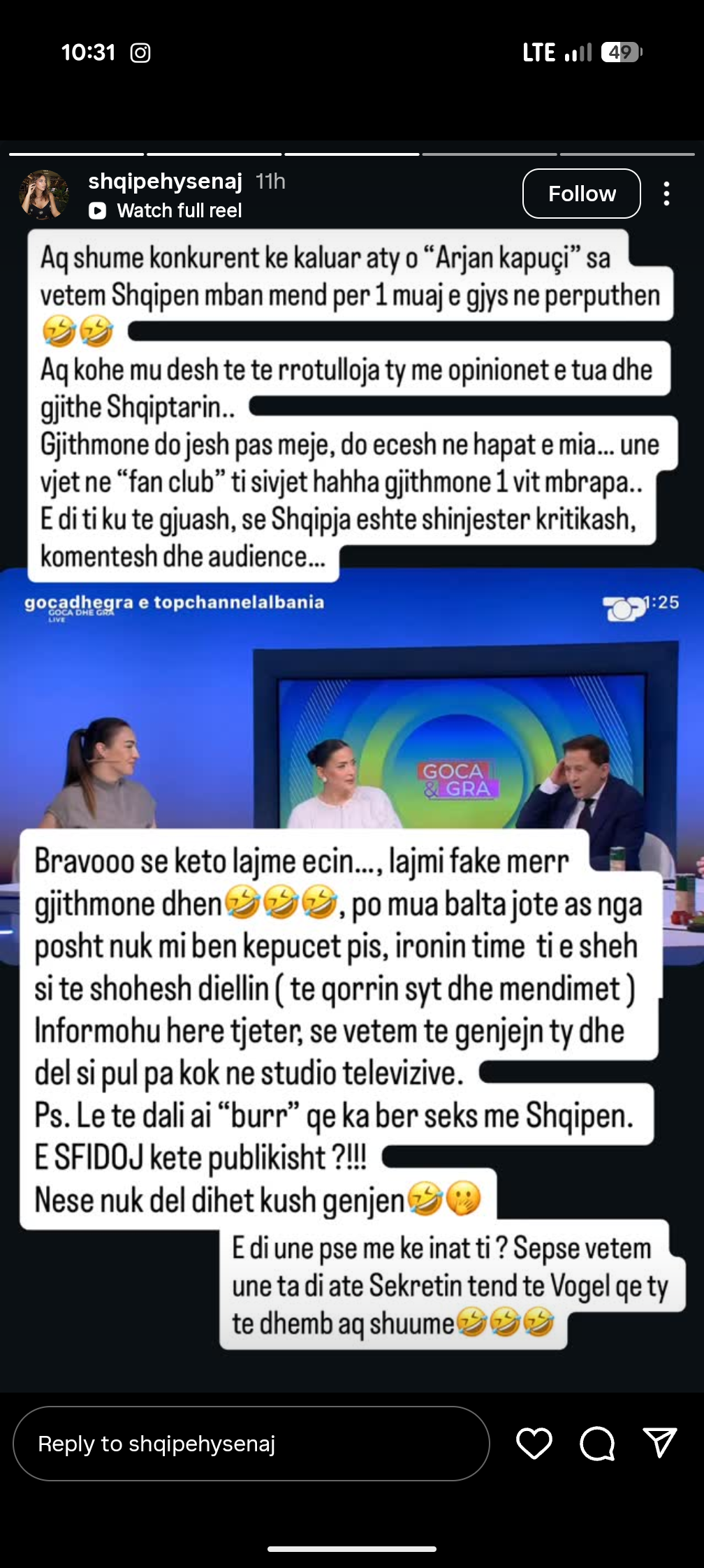 “Bravo se këto lajme ecin…, lajmi fake merr gjithmonë dhen, po mua balta jote as nga poshtë nuk mi bën këpucët pis… Informohu herë tjetër, se vetëm të gënjejnë ty dhe del si pulë pa kokë në studio televizive. Ps. Le të dali ai ‘burrë’ që ka bërë seks me Shqipen. E SFIDOJ këtë publikisht?!!! Nëse nuk del dihet kush gënjen.”