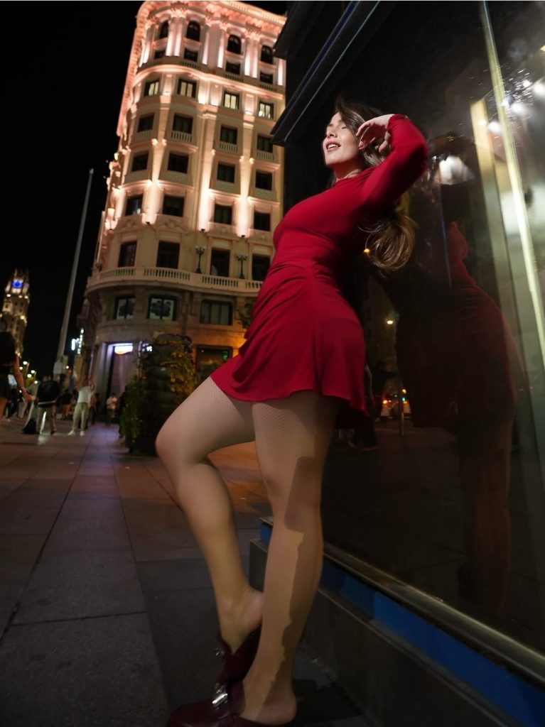 E veshur me një fustan të shkurtër ngjyrë të kuqe, që i thekson linjat trupore, Olta është shfaqur mjaft provokuese në rrugët e Madridit, duke reflektuar vetëbesim dhe elegancë në çdo detaj.