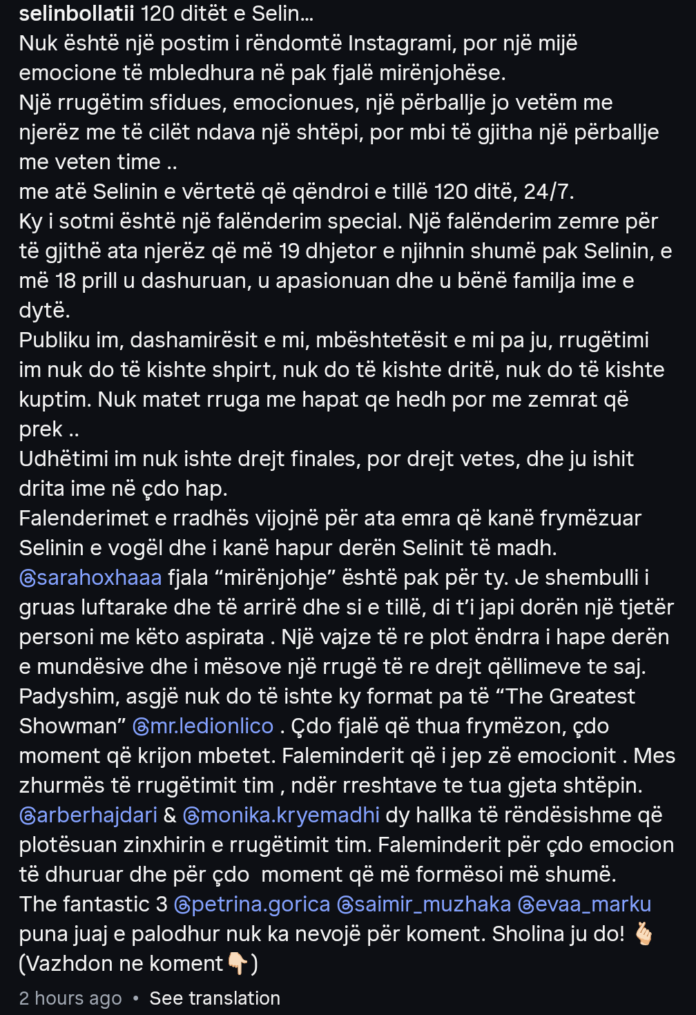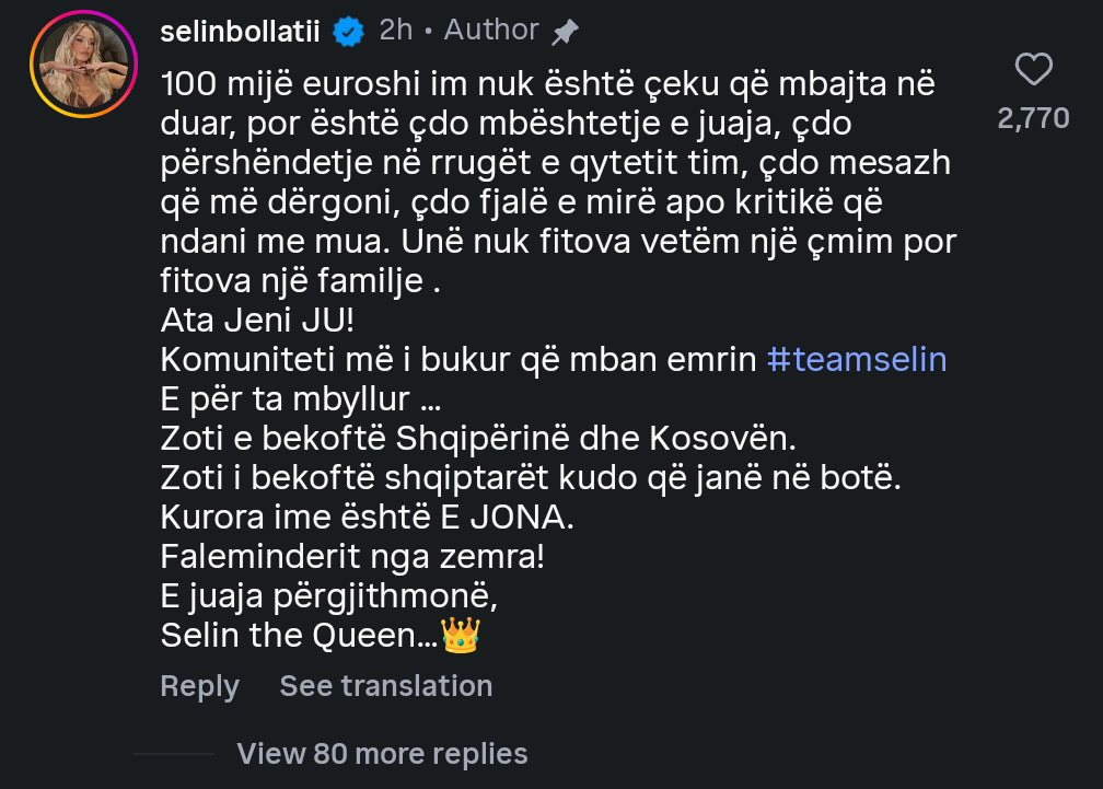 Në postimin e parë, e shfaqur me fustanin e saj magjepsës të finales, Selin ka zgjedhur të bëjë një dedikim të gjatë e plot mirënjohje.