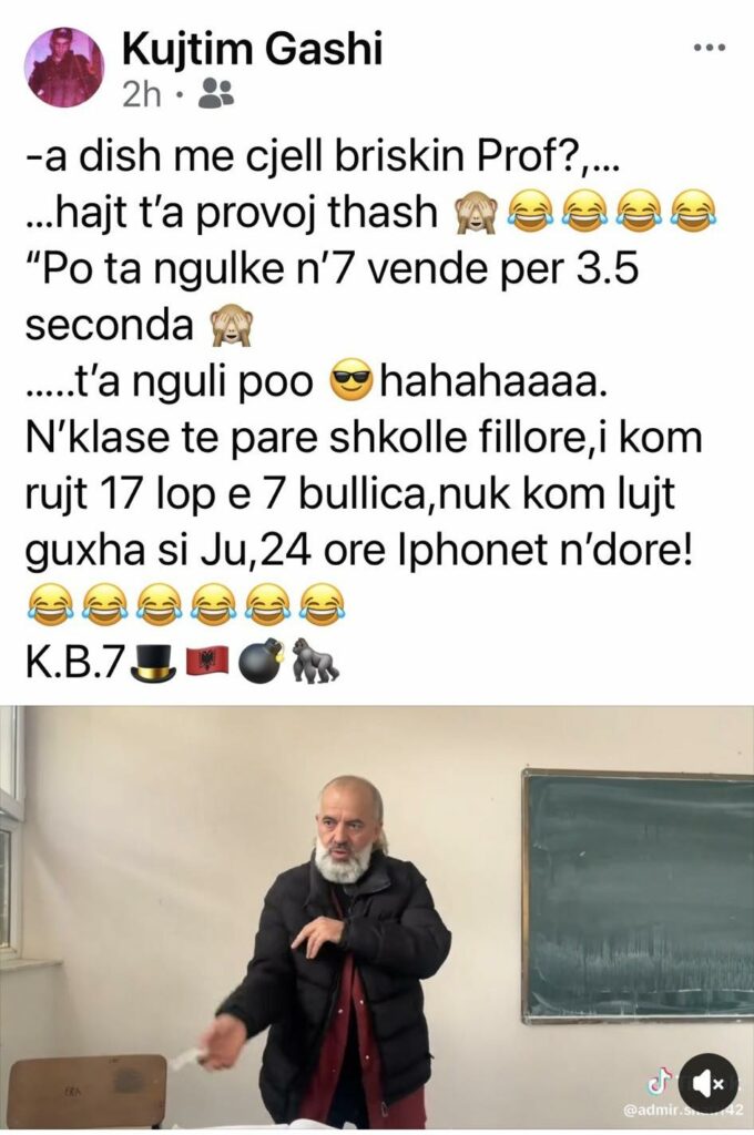 Në një video skandaloze, e cila është publikuar në Tik tok, Gashi shihet teksa demonstronte teknika të mbrojtjes dhe sulmit me thikë, gjatë orës mësimore.