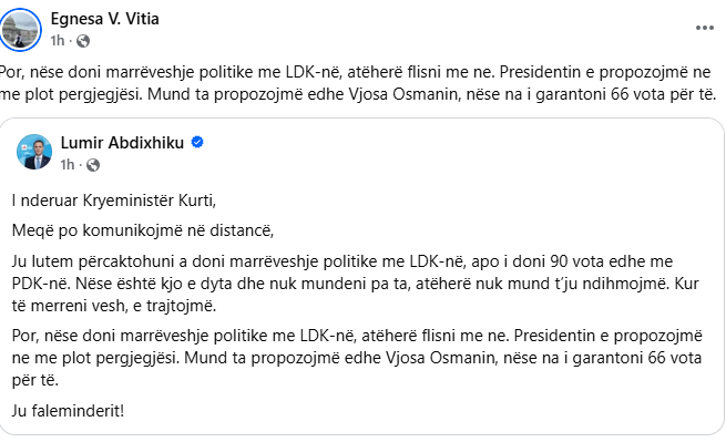 Kryetari i LDK-së, Lumir Abdixhiku, i është drejtuar kreut të VV-së, Albin Kurti, edhe përmes një postimi në “Facebook”.