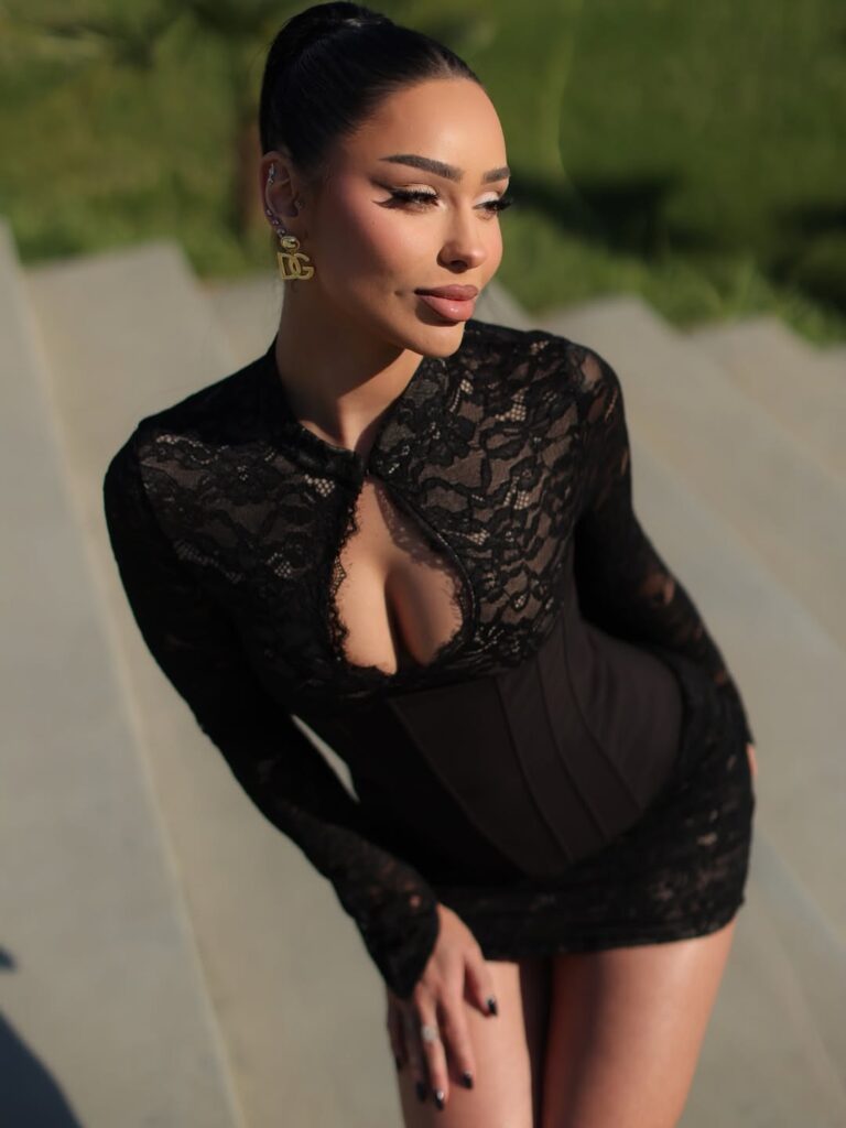 E veshur me një fustan të zi të shkurtë, vuri në pah hiret e bukura trupore.