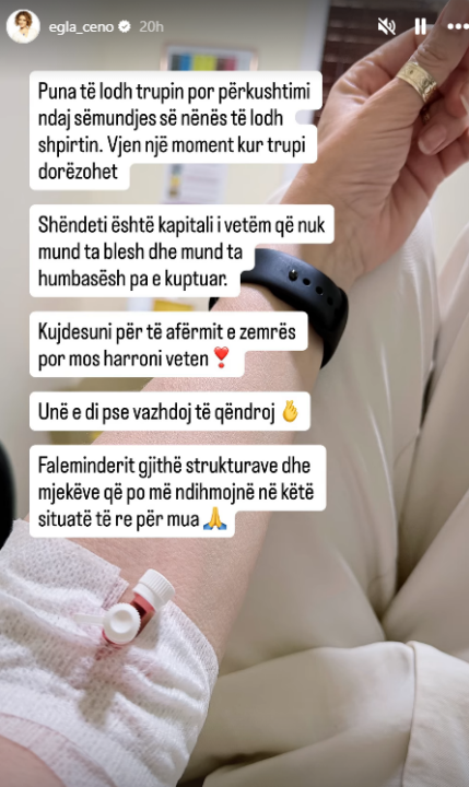 “Puna të lodh trupin por përkushtimi ndaj sëmundjes së nënës të lodh shpirtin. Vjen një moment kur trupi dorëzohet. Shëndeti është kapitali i vetëm që nuk mund ta blesh dhe mund ta humbasësh pa e kuptuar. Kujdesuni për të afërmit e zemrës por mos harroni veten. Unë e di pse vazhdoj të qëndroj. Faleminderit gjithë strukturave dhe mjekëve që po më ndihmojnë në këtë situatë të re për mua”, ka shkruar ajo në postimin në Instastory”.